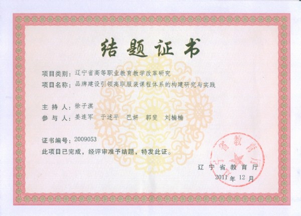 辽宁省高等教育教学改革研究结题证书